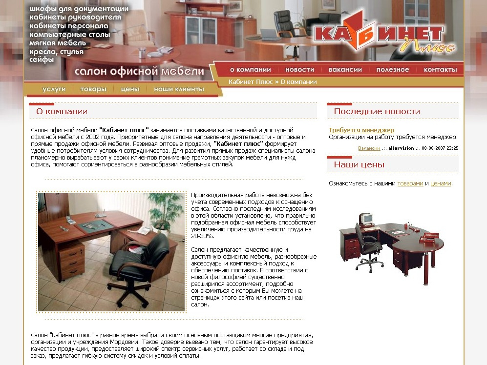 Салон офисной мебели "Кабинет плюс" занимается поставками качественной и доступной офисной мебели с 2002 года. Приоритетные для салона направления деятельности - оптовые и прямые продажи офисной мебели. Развивая оптовые продажи, "Кабинет плюс" формирует удобные потребителям условия сотрудничества. Для развития прямых продаж специалисты салона планомерно вырабатывают у своих клиентов понимание грамотных закупок мебели для нужд офиса, помогают сориентироваться в разнообразии мебельных стилей.