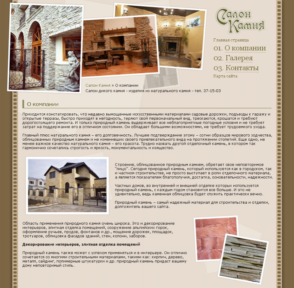Сайт-визитка Салона камня, где Вас ждёт обширная фотогалерея образцов камня и уже выполненных отделочных работ.