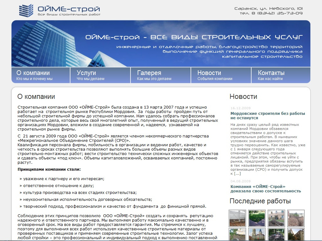 Сайт-визитка для строительной компании ОЙМЕ-строй, предлагающей полный спектр строительных услуг организациям Саранска.