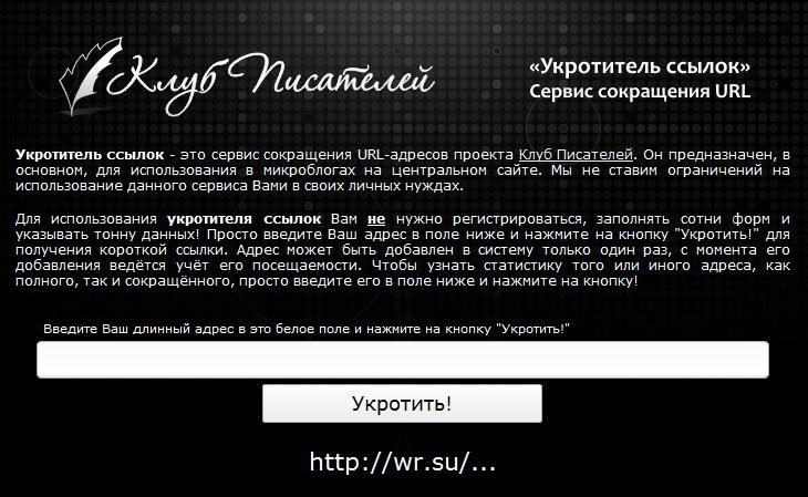 Укротитель ссылок - это сервис сокращения URL-адресов проекта Клуб Писателей. Наш сервис позволяет сокращать длинные ссылки до менее чем 20 символов. Он предназначен, в основном, для использования в микроблогах на центральном сайте, но может легко применяться повсеместно.